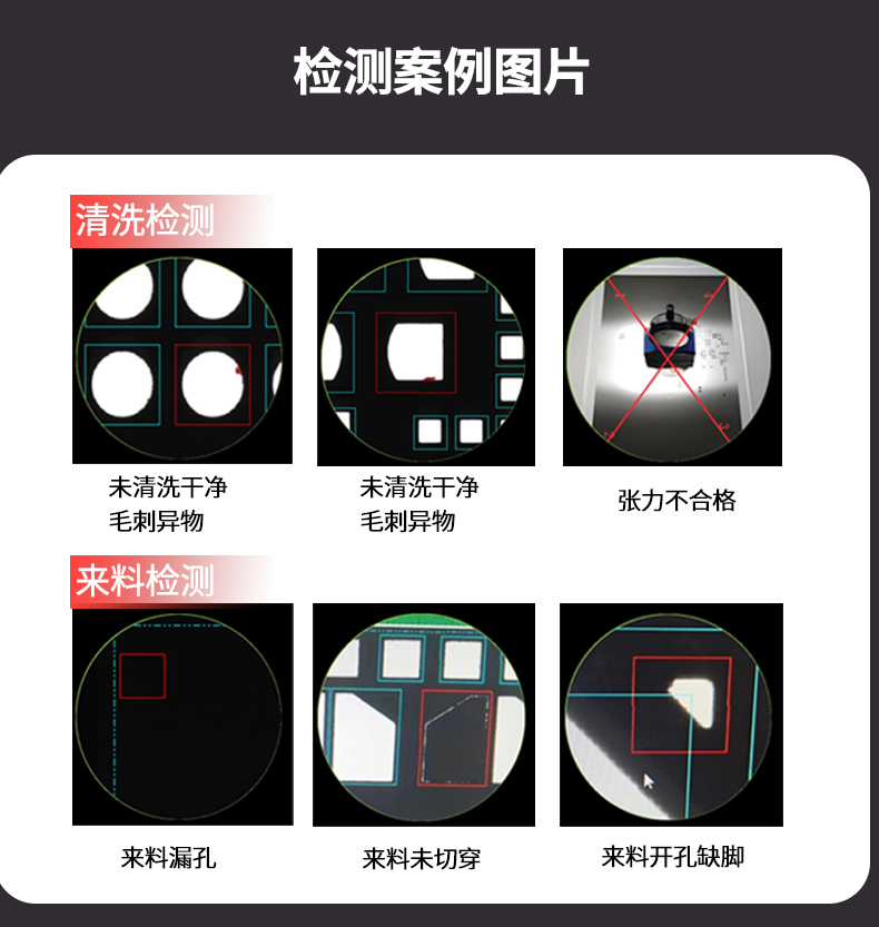 檢測項目開孔面積、位置、偏移、尺寸、異物、毛刺、堵孔、多孔、少孔、張力、厚度