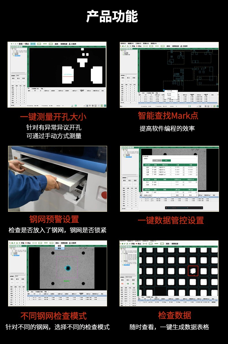 鋼網檢查機主要用于對鋼網的開孔尺寸、面積、偏移、異物、毛刺、堵孔、多孔、少孔、張力進行檢測,測試數據可以開放權限供客戶抓取上傳MES,我們會自動輸出標準的TXT文件供數據上傳,符合智能化工廠的發展需求。鋼網檢查機可以有效的解決來料不良及清洗不良,完善清洗工藝,從源頭上解決多錫、少錫、連焊等印刷問題。